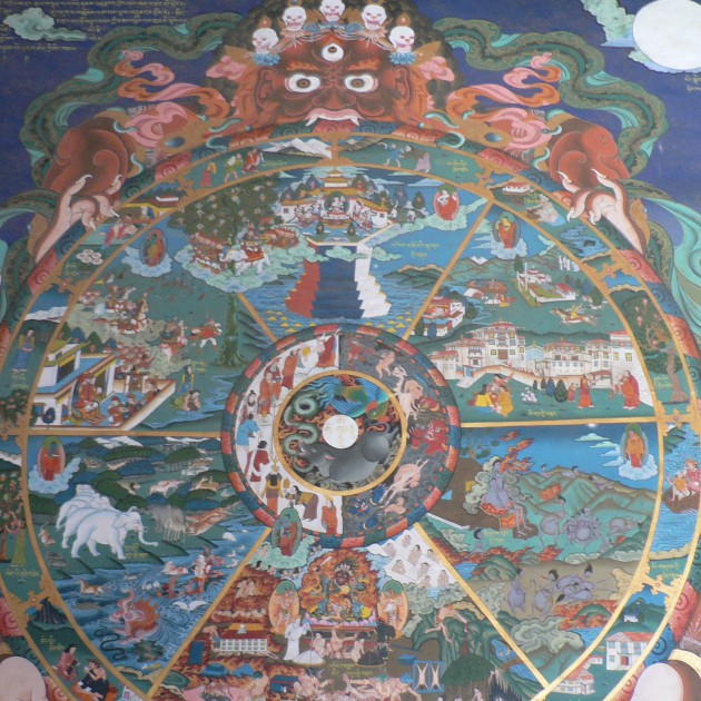 Das Lebensrad im Buddhismus stellt den immerwährenden Zyklus des Seins dar - den Kreislauf des Werdens und Vergehens. Der Austritt aus dem Kreislauf der Wiedergeburten ist der Zustand der Erlöstheit. Im Hinduismus ist das Moksha, im Buddhismus das Nirwana. Das Lebensrad ist oft an den Türen oder auch außen auf Tempeln zu finden um jedem Menschen kurz zusammengefasst die Lebensphilosophie des Buddhismus zu erklären. Zuerst ein schematischer Überblick wie das Lebensrad meist aussieht und ein konkretes Beispiel daneben: